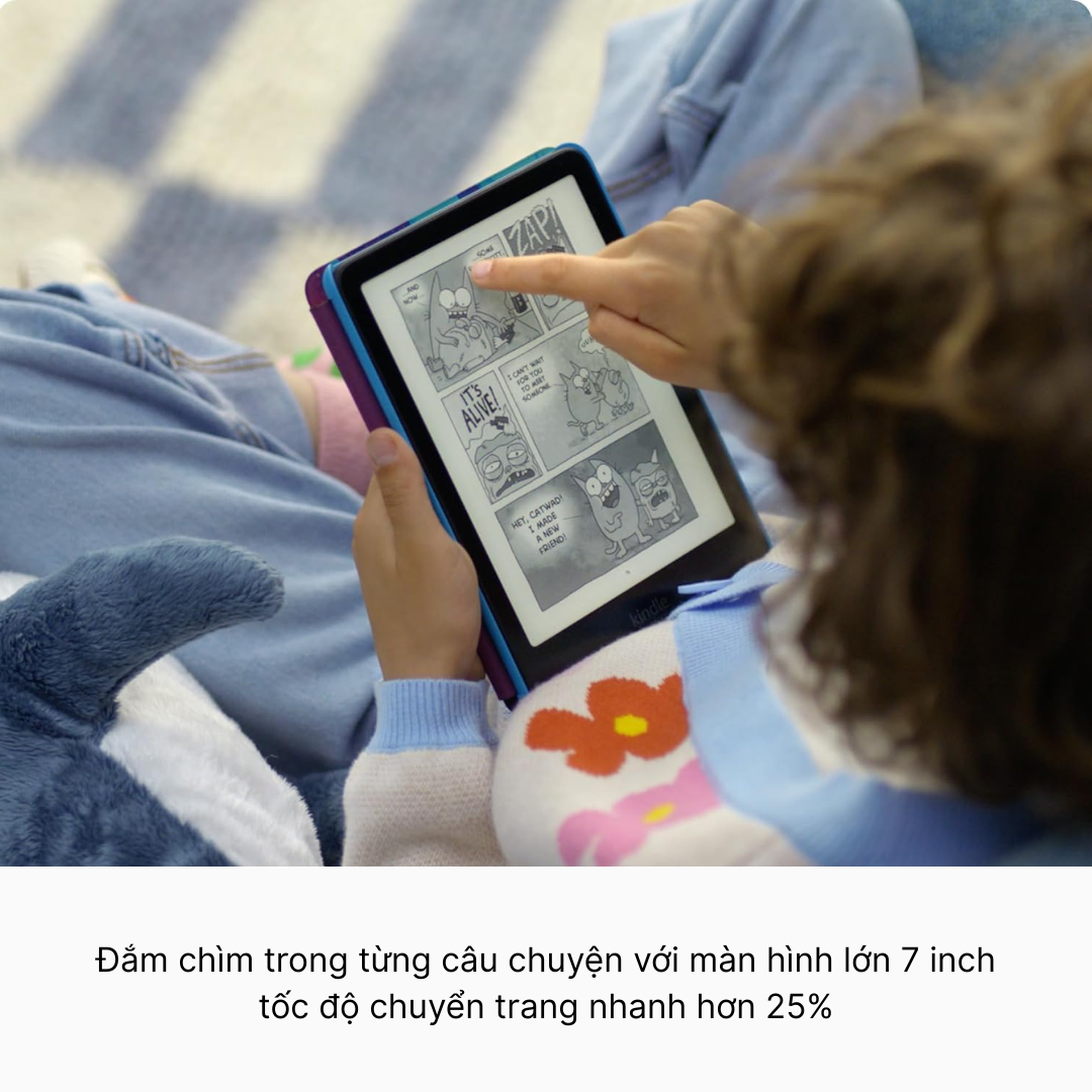 - Kindle Paperwhite Kids mỏng nhất và nhanh nhất từ trước đến nay – Sẵn sàng, thiết lập, đọc trên màn hình Paperwhite 7” thế hệ tiếp theo với tỷ lệ tương phản cao hơn và tốc độ lật trang nhanh hơn 25%.