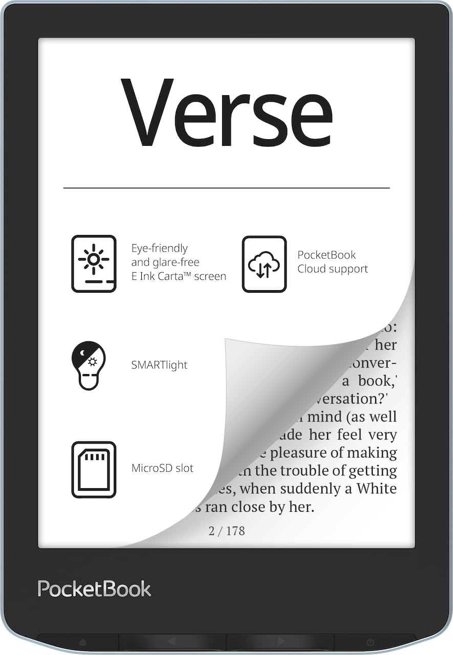 • Thiết kế bắt mắt, công thái học và nhỏ gọn: PocketBook Verse là một máy đọc sách điện tử nhẹ (chỉ 182 g) với thiết kế tối giản và hai màu sắc ấn tượng – Xanh dương sáng và Xám mờ. Thiết bị cực kỳ thân thiện với người dùng nhờ các nút điều khiển cơ học và màn hình cảm ứng.